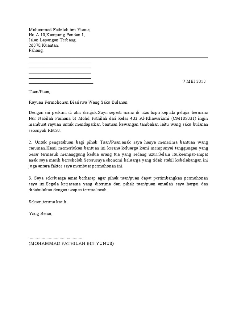 Sebagai bahan referensi di bawah ini ada beberapa contoh surat permohonan beasiswa yang bisa anda pergunakan. Contoh Surat Rayuan Haji Download Lampiran 2. Nama anda Nombor kad pengenalan Alamat anda Tarikh Alamat penaja Tuan PERMOHONAN BIASISWA ABC UNTUK TAHUN 2013 Merujuk kepada tawaran biasiswa yang dikeluarkan oleh pihak Tuan saya dengan ini menghantar permohonan saya untuk dipertimbangkan oleh pihak Tuan.